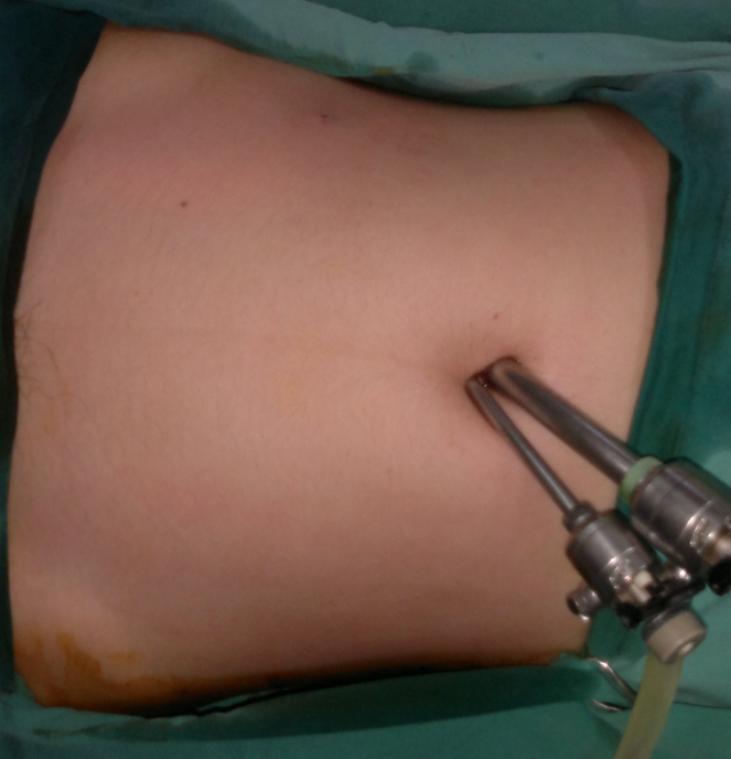 Rạch da khoảng 1,5cm ngay chính giữa rốn và đặt 2 trocar bằng cách đục thủng 2 lỗ cân rốn dưới đường rach.