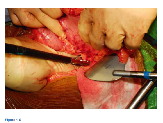 - The stomach is retracted anteriorly, and the pedicle of the left gastric artery is identified. Sharp dissection with blunt-tip scissors or with cautery is used to dissect all nodes at the origin of the left gastric artery and sweep them onto the specimen. Celiac nodes can also be dissected in this fashion (Figure 1-4) The base of the left gastric artery is clamped with an endovascular stapler that is 45 mm in length and 2.5 mm in height. The right gastroepiploic artery should be palpated at this point to insure that the celiac axis has not been clamped and the stapler is fired. (Figure 1-5)
