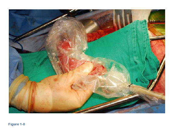 - The conduit is placed into the bag, properly oriented so that the staple line is on the patient's right side. Suction is applied to the drainage port of the Foley and the assistant draws the Foley up into the neck. The surgeon on the right side of the abdomen grasps the bag containing the tip of the conduit and guides it up into the chest, until the pylorus lies at the hiatus. (Figures 1-8 and 1-9)